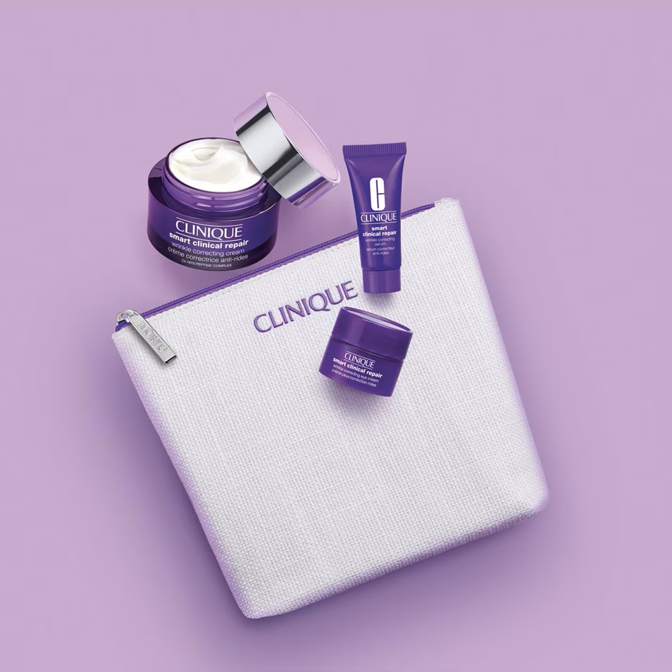 Ο «έξυπνος» συνδυασμός της Clinique ενάντια στη γήρανση περιλαμβάνει ορό, κρέμα ματιών και αντιρυτιδική κρέμα προσώπου σε κανονικό μέγεθος, όλα σε ένα πολυτελές νεσεσέρ.