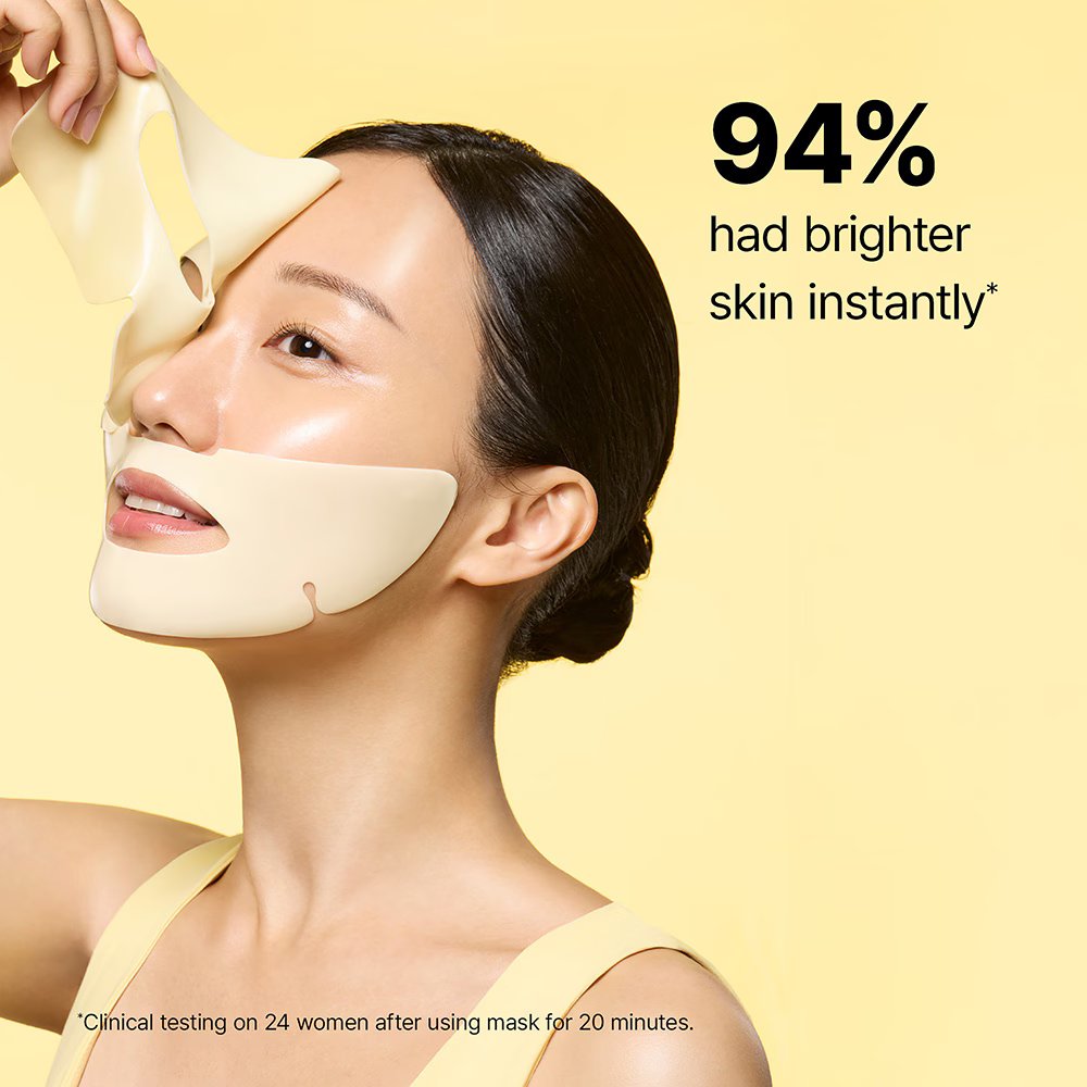Μια μάσκα προσώπου από καουτσούκ που δροσίζει άμεσα την επιδερμίδα και μια συμπυκνωμένη αμπούλα με υφή ορού, με Νιασιναμίδη για φωτεινότητα και Πεπτίδια για ορατή σύσφιξη.