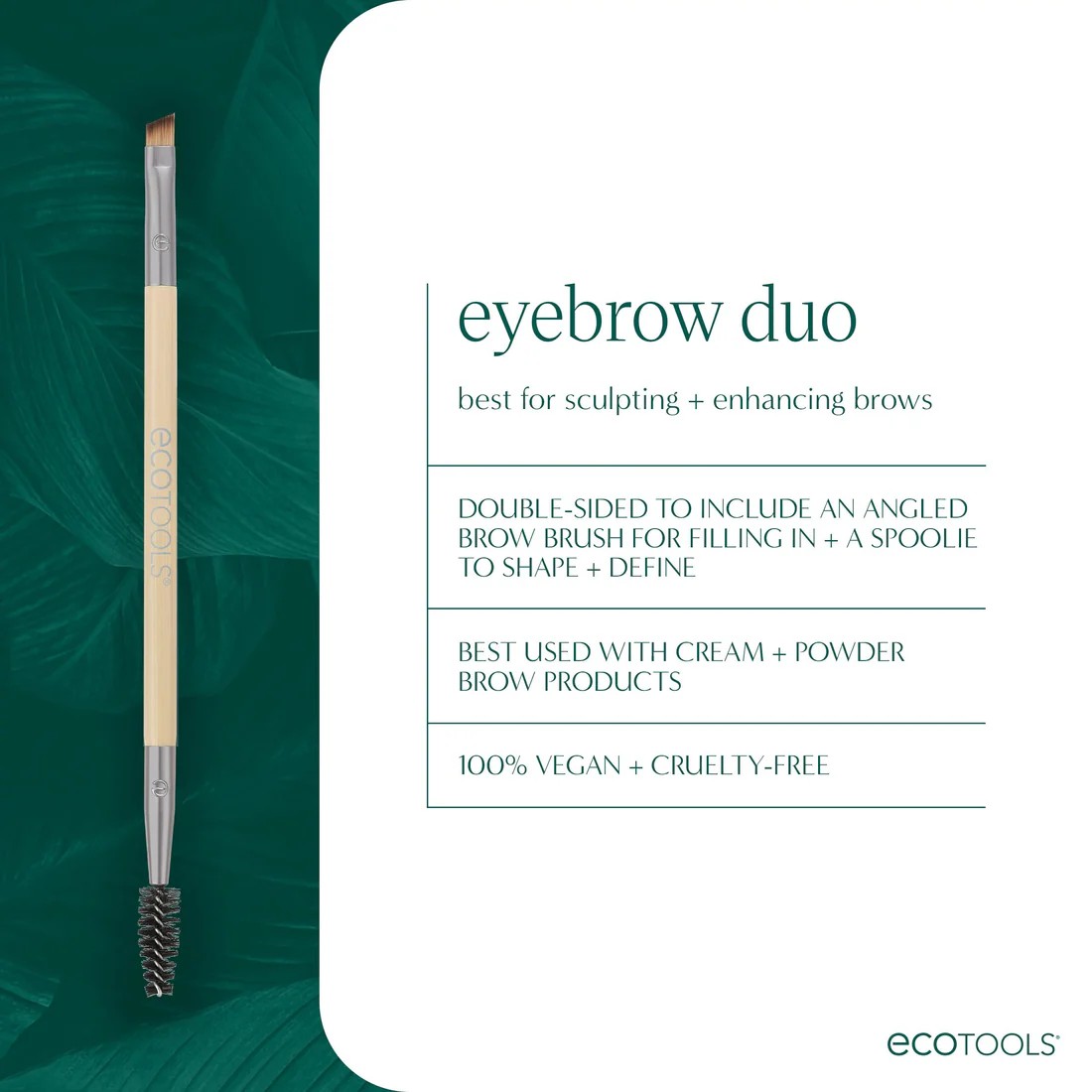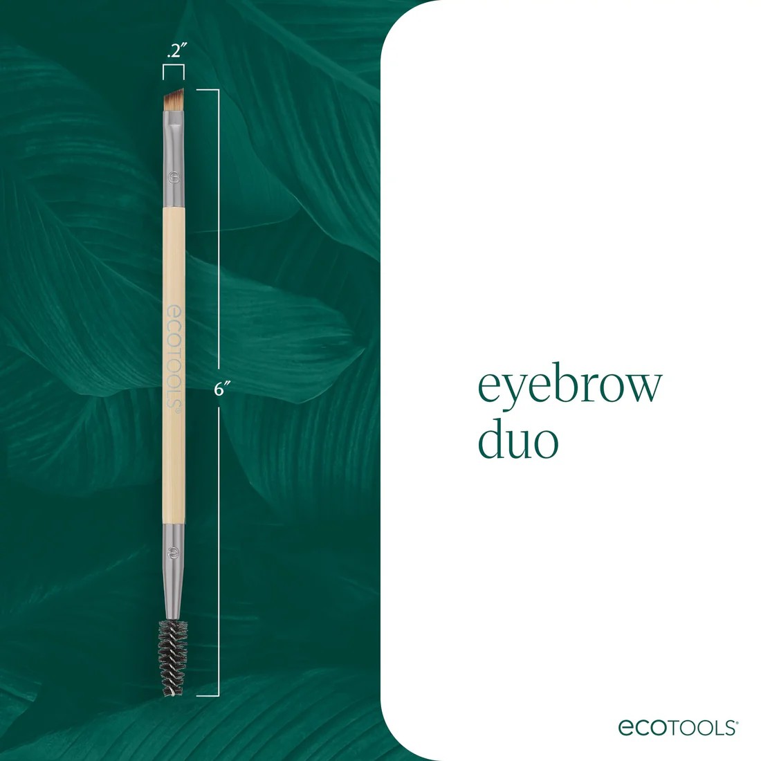 Το EcoTools Eyebrow Brush Duo είναι ένα διπλό εργαλείο με βουρτσάκι και λοξοτομημένο πινέλο φρυδιών, που σας βοηθά να τακτοποιήσετε και να διαμορφώσετε τα φρύδια σας με ένα μόνο εργαλείο.