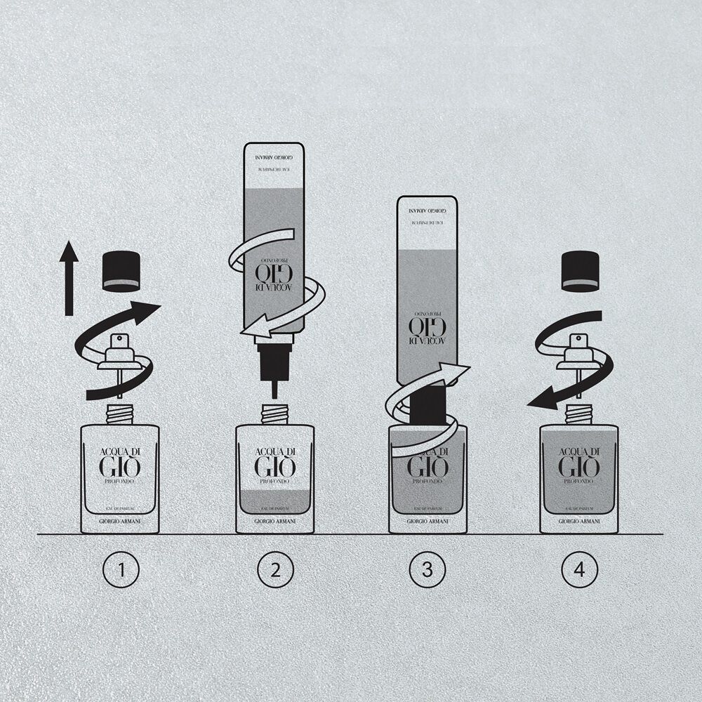 Για την εξέλιξη του Acqua Di Giò, ο Giorgio Armani αποκαλύπτει ένα νέο, μοντέρνο μπουκάλι, το οποίο σχεδιάστηκε ώστε να μπορεί να επαναγεμίζεται.
