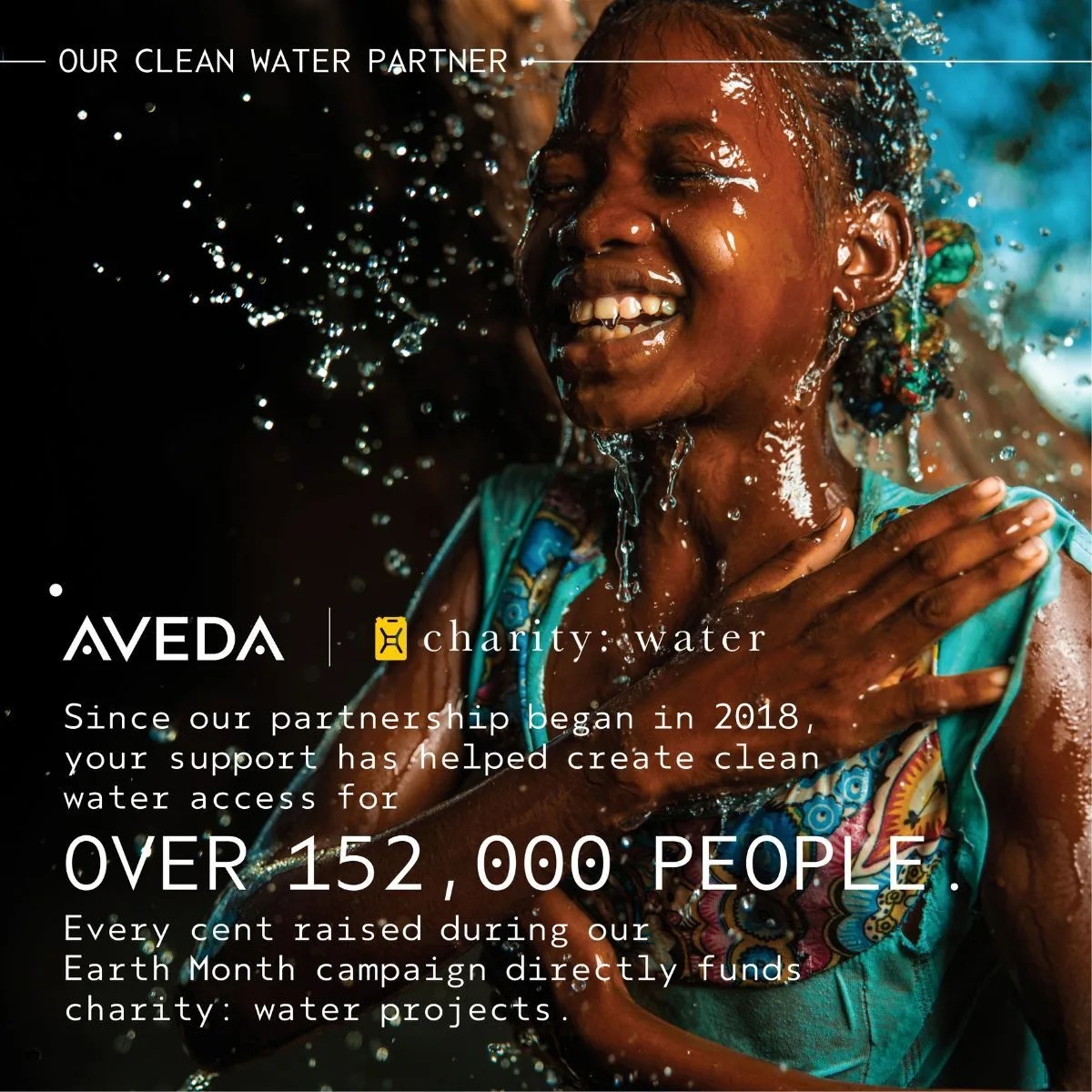 Από τον Μήνα της Γης του 2018, η Aveda συνεργάζεται με την Μ.Κ.Ο «Charity Water», ώστε να προσφέρει πρόσβαση σε καθαρό νερό σε ανθρώπους σε όλο τον κόσμο.