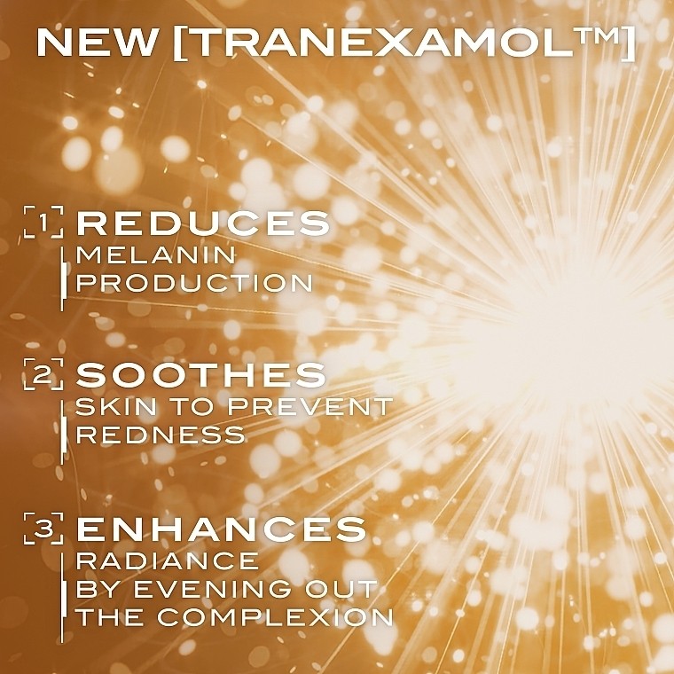 Combination of Tranexamic Acid & Bisabolol. Reduce melanin production, soothe the skin to prevent redness, and enhance radiance by evening out the complexion.
