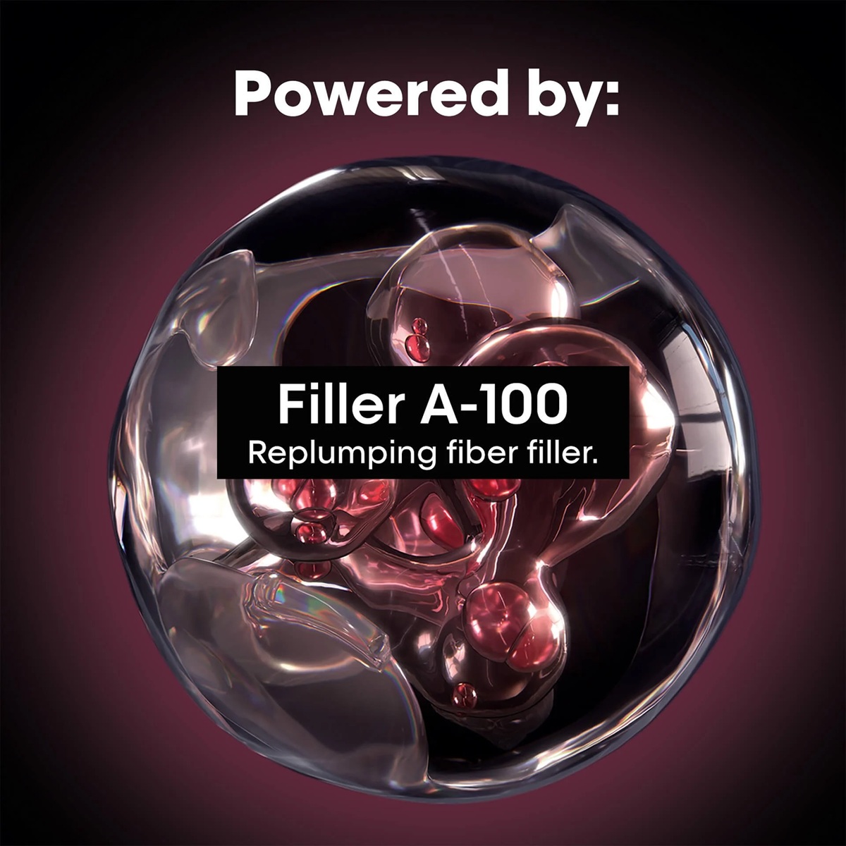 FILLER-A100, a patented technology exclusive to L'Oréal Professionnel, penetrates the hair core, strengthening density at the ends and offering reconstruction.