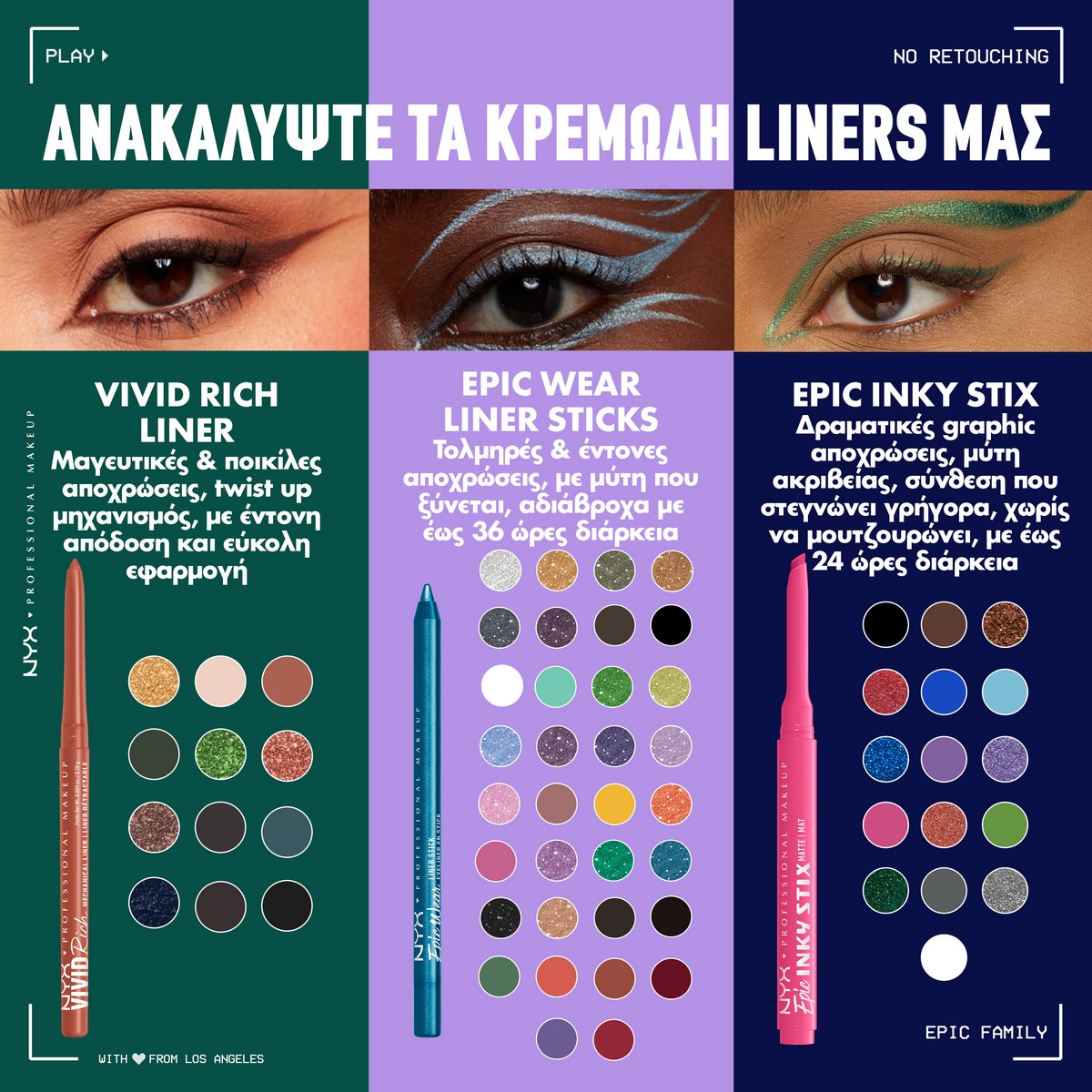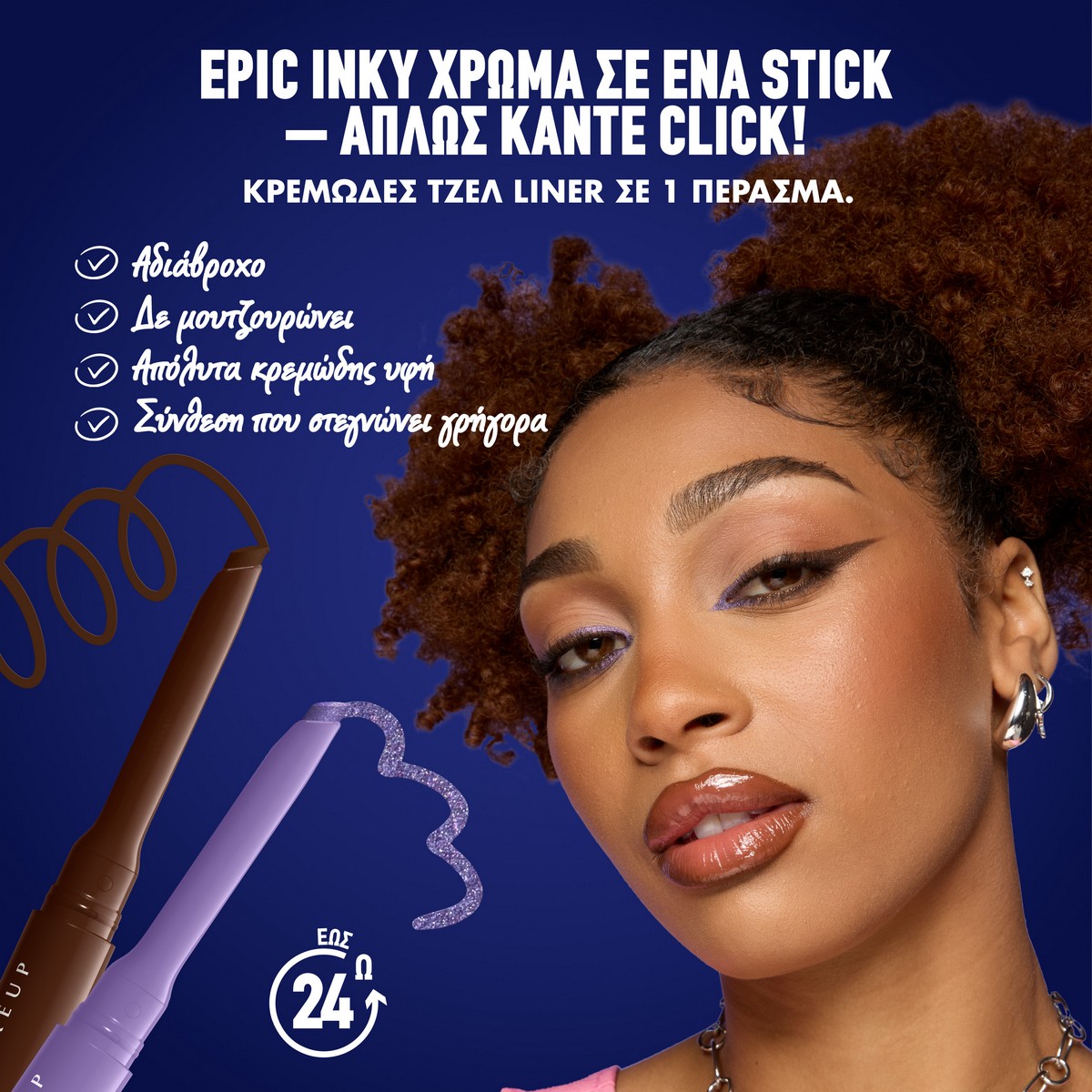 Whether you're crafting everyday definition or dramatic, head-turning artistry, Epic Inky Stix waterproof cream gel eyeliner delivers the intense payoff, precision, and long-wear performance you need.